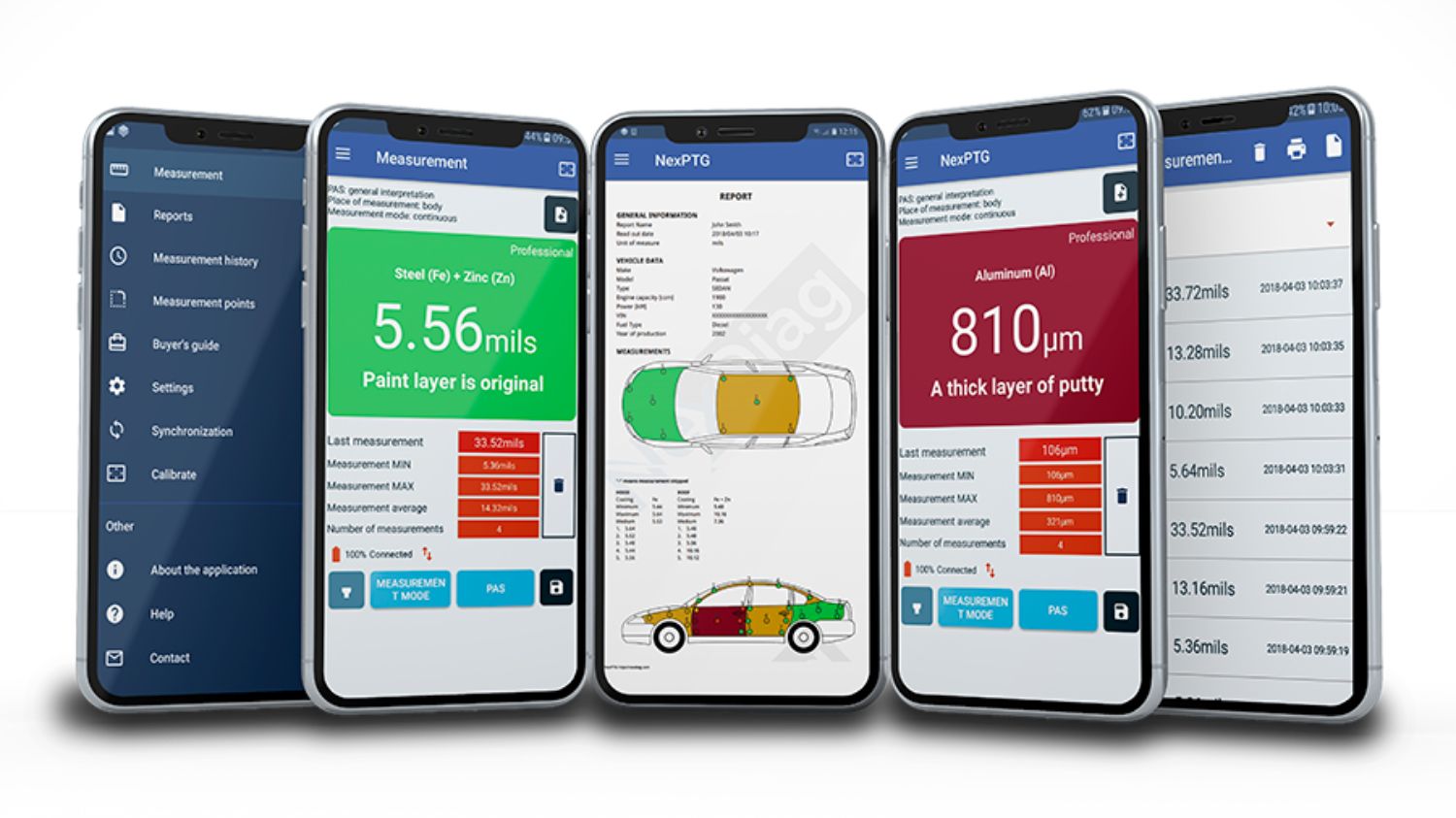 NexPTG devices are the most innovative wireless thickness gauges on the market. NexPTG devices perform 10 measurements per second and show very precise readings, what is more, it can be used to check virtually any car. NexPTG automatically recognizes and tests the lacquer coating on steel and aluminium elements.